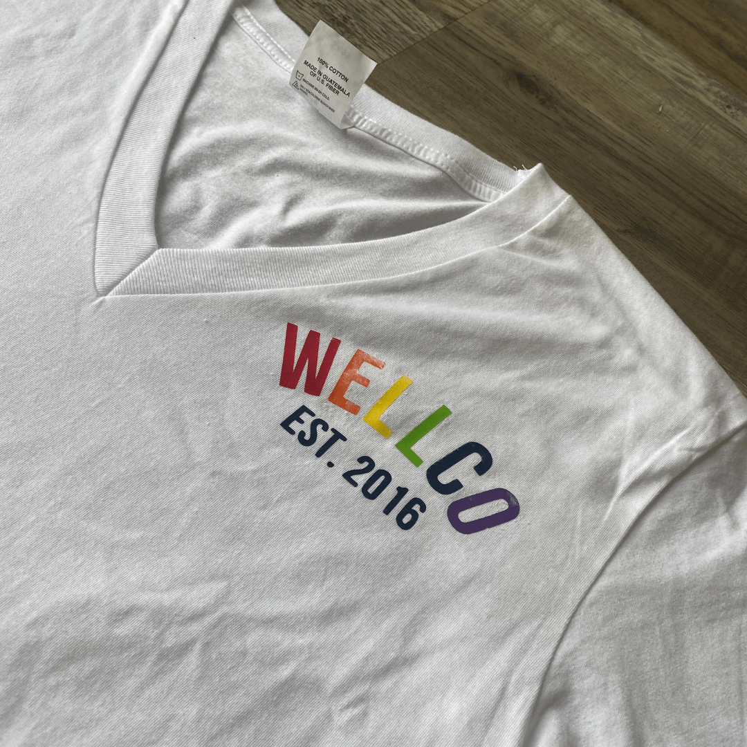Celebrate Pride Month in this 100% Cotton V-Neck Tee with applied rainbow vinyl lettering. 50% of proceeds will be donated in support of Pride Month!
